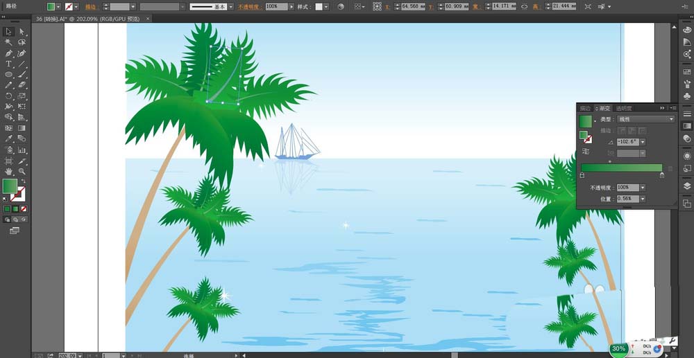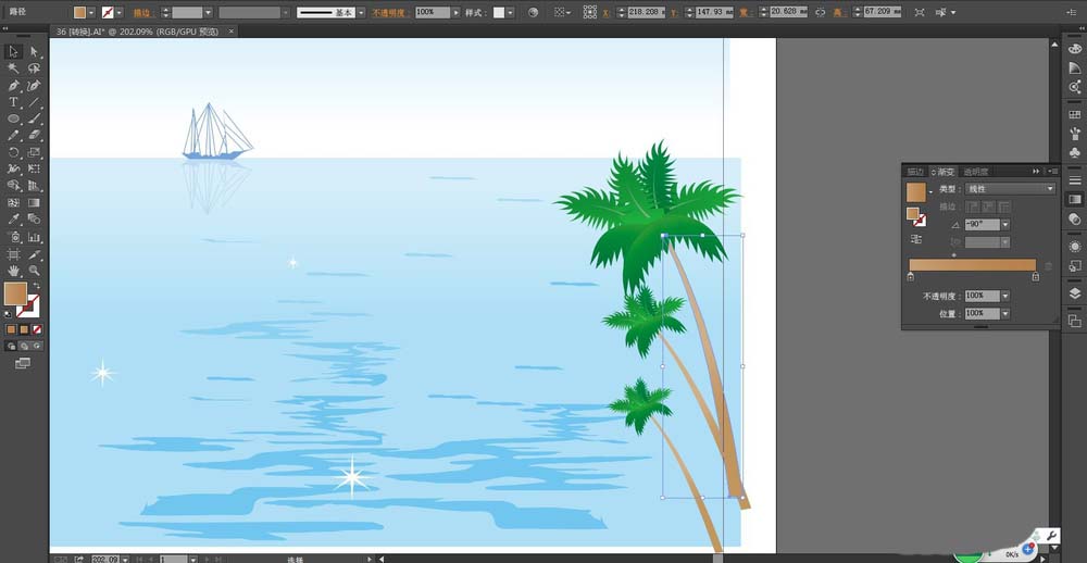 3、这一步,我们开始绘制出海边的高高的树木,我们先画出树叶的轮廓并用绿色的渐变填充,再画出树杆的路径,我们用棕色的渐变填充。复制这树变成更多的树,改变一下大小与位置。