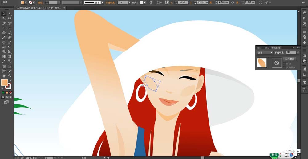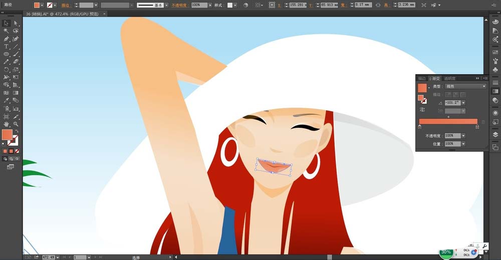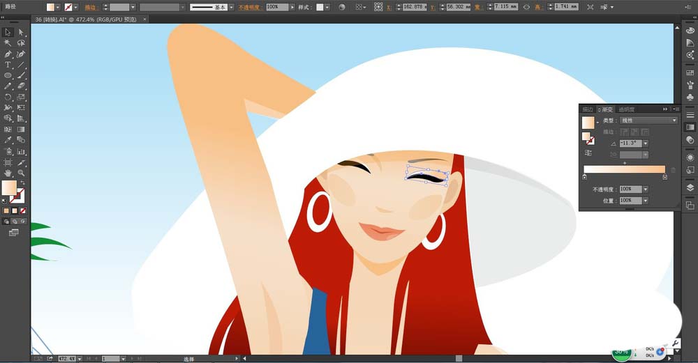 5、接着,我们来画一画女子的身体轮廓路径,她的动作是一手扶着帽子,一手自然放下,红色的头发、白色的帽子。我们用粉色的渐变填充女子的手臂,用淡粉色的渐变填充女子的脸蛋,用半透明灰白色填充帽子的暗光区域,用半透明的粉色渐变填充女子的脸晕,用粉色的渐变与黑色搭配填充女子的眼晴与眉毛。