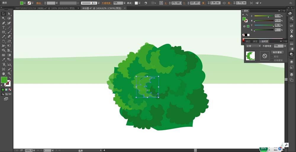 2、使用钢笔画出一棵小小的灌木,我们用不同明度的绿色填充不同的路径。
