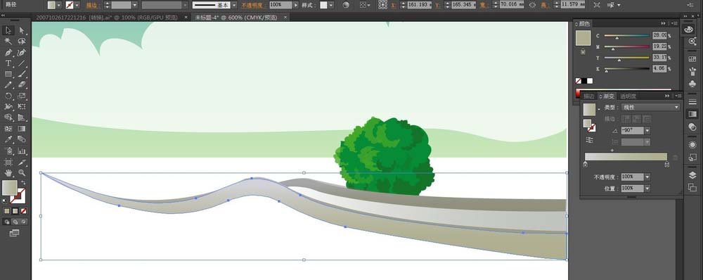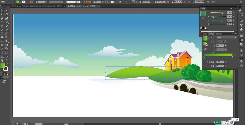 7、继续用钢笔勾勒出大片的绿地的路径,我们用绿色的渐变填充。