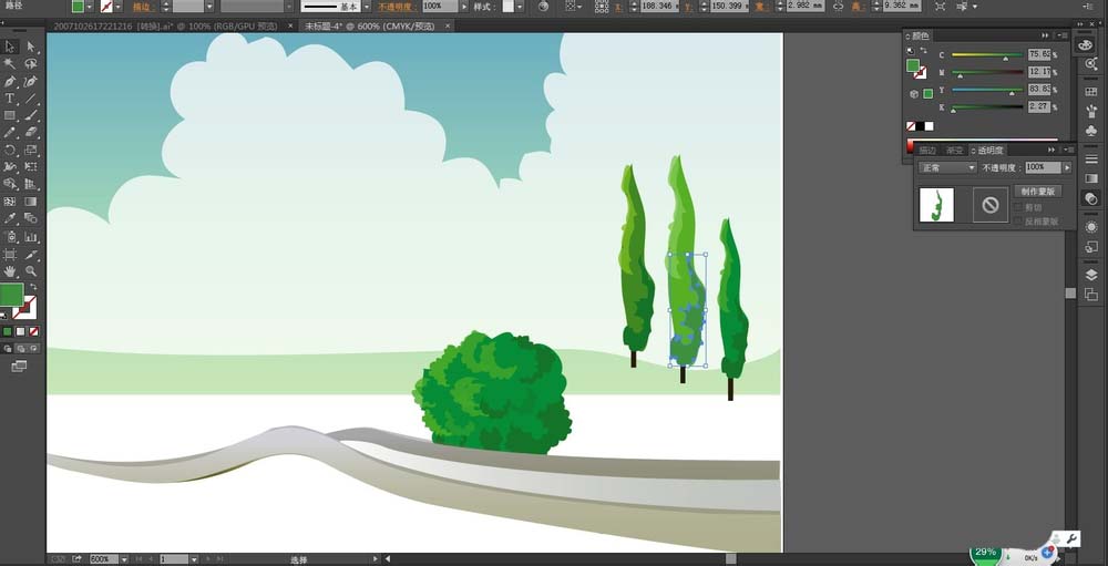 4、使用钢笔画出高高的小树的路径,我们用不同的绿色填充小树的枝叶与枝条的路径。