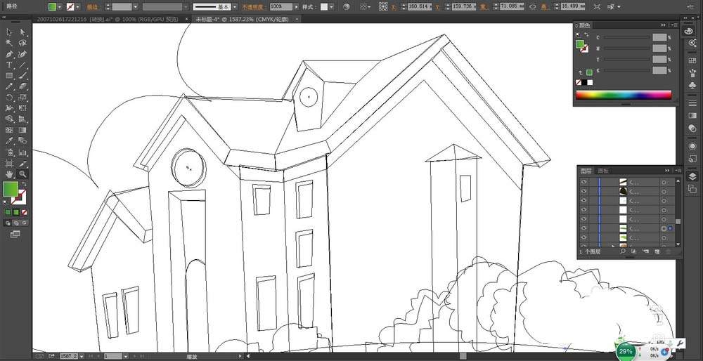 5、使用钢笔画出小房屋的结构路径,主要有屋顶、墙壁、门窗等多种不同元素的路径。