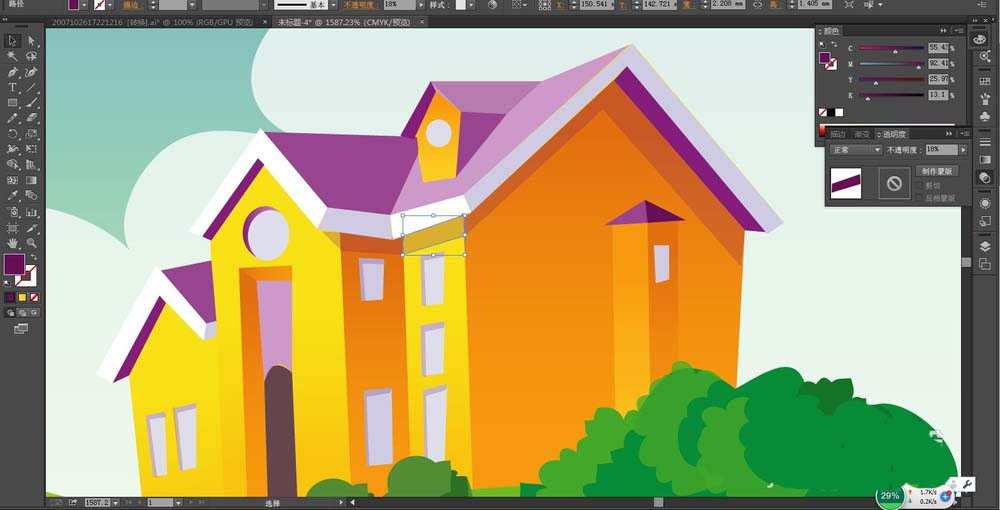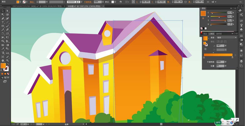 6、用紫红色的渐变填充屋顶、用橙黄色的渐变填充墙壁,用半透明的橙色填充屋顶下方的阴影。用白色与灰色填充门窗与阴影。