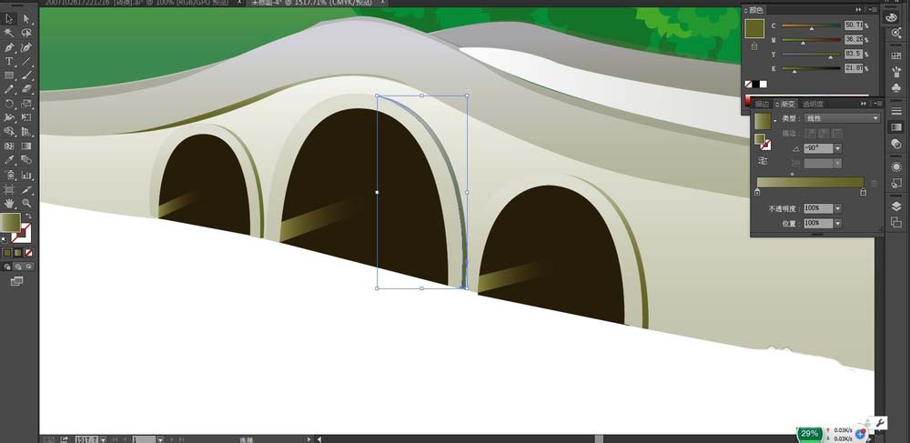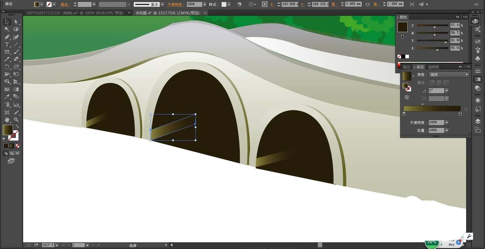 8、使用钢笔画出路中间的小桥的细节元素的路径,我们用灰黑色的渐变填充,在边缘用半透明的灰色呈现暗光效果。