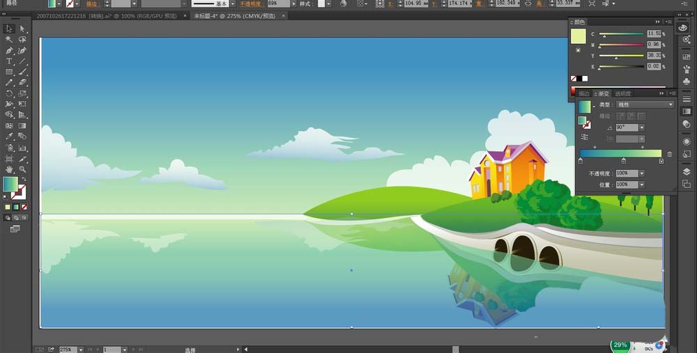 9、复制小屋与绿地让其先旋转再对称,我们让其成为一个倒影的状态,再用矩形画出水面的效果,设置水面呈现半透明的状态,完成田园图片设计。