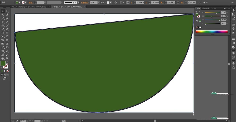 1、先用钢笔画出一片西瓜的基本轮廓,我们画出一个半圆形的弧,再用绿色填充,用灰黑色进行描边。