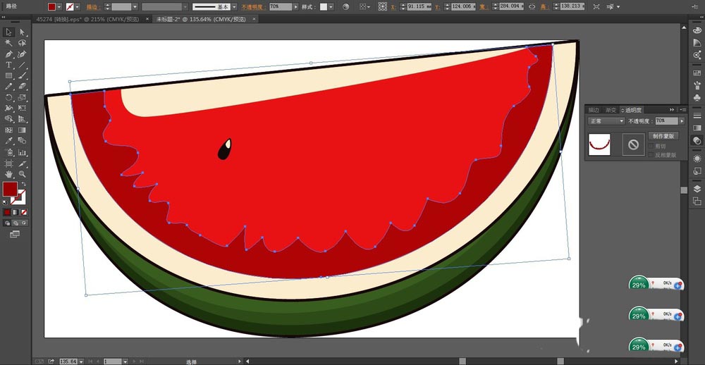3、继续复制这个西瓜的内部路径,我们缩小到95%再填充暗红色。