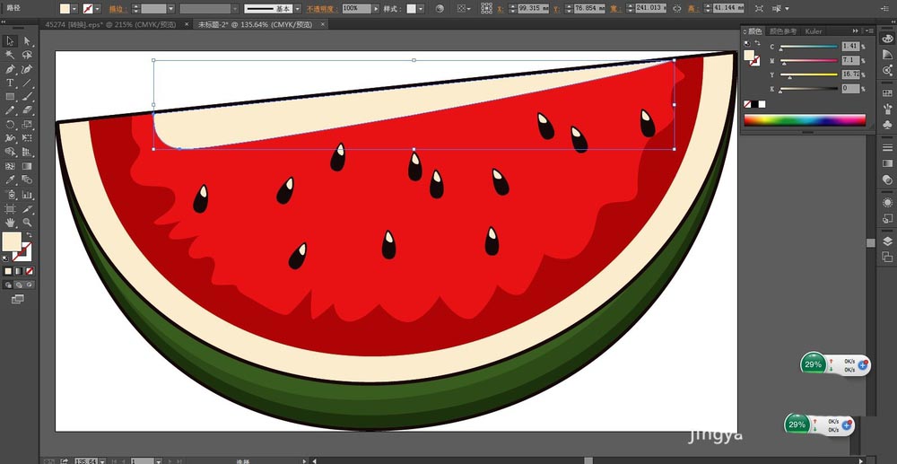 2、复制这个西瓜的路径再缩小到95%,我们用米黄色填充这个西瓜的内部路径。