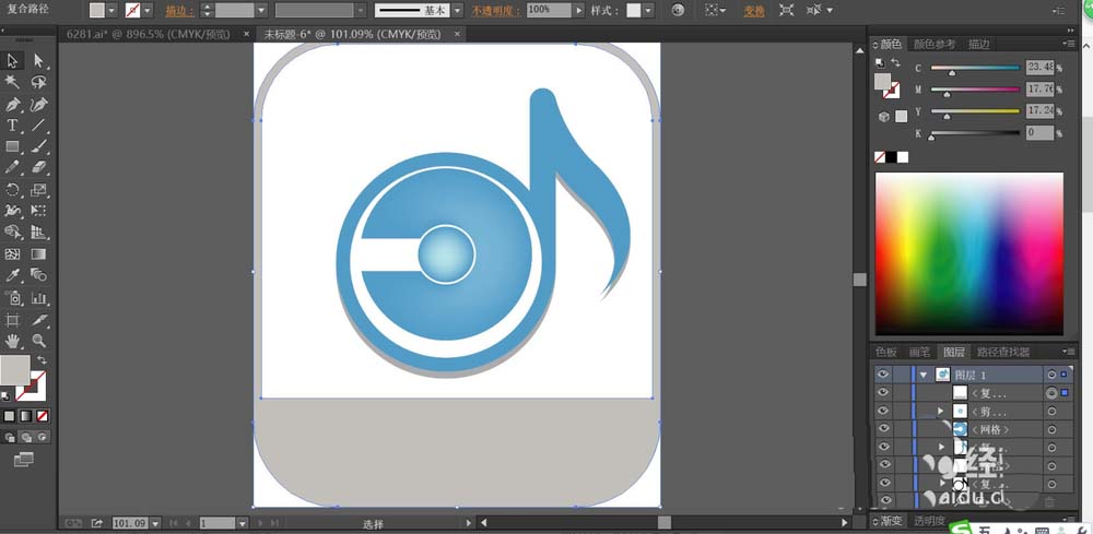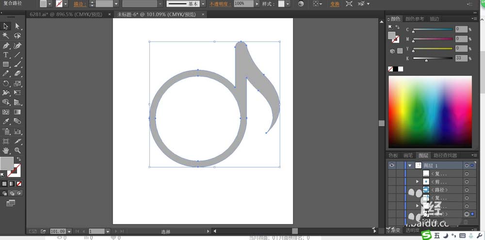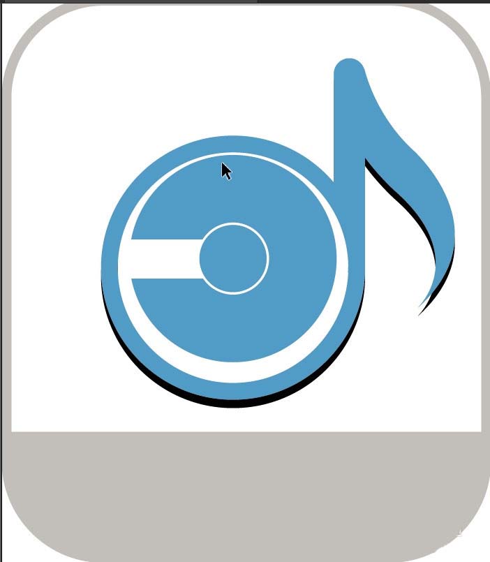 1、选择圆形工具画出一两个圆形,我们用两个圆形截取出粗边的圆形,再用钢笔画出音符的弯钩路径,我们让两个路径组合在一起,我们先填充灰色。