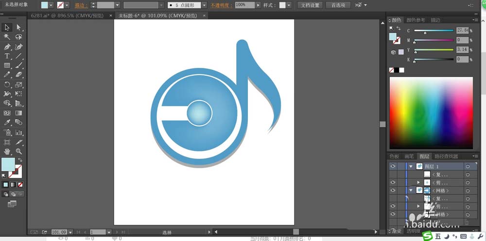 3、这一步,我们开始绘制这个音符的细节元素,用圆形与矩形组合成镂空的形状并填充一个白色放在最上层。再画出一个蓝色的圆形放在下方,让镂空形状与圆形做一个复合路径效果。