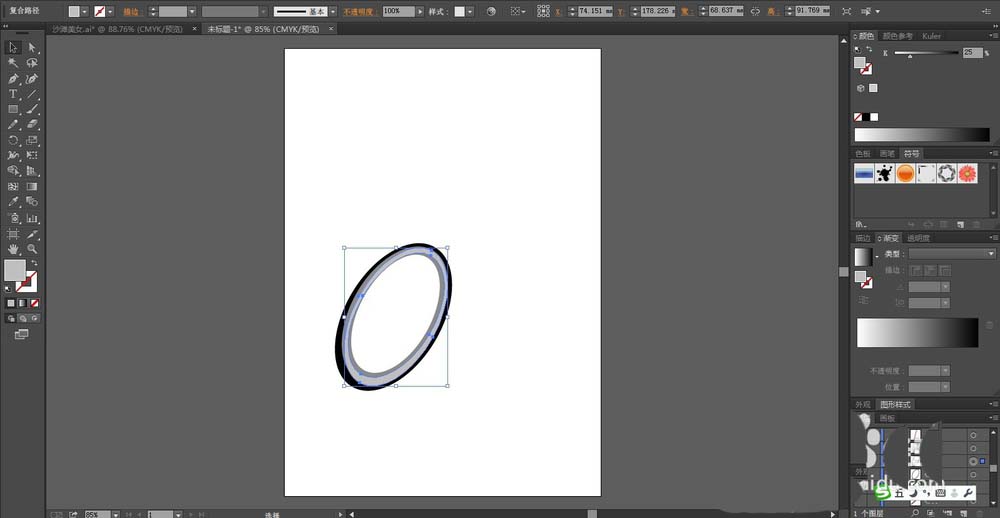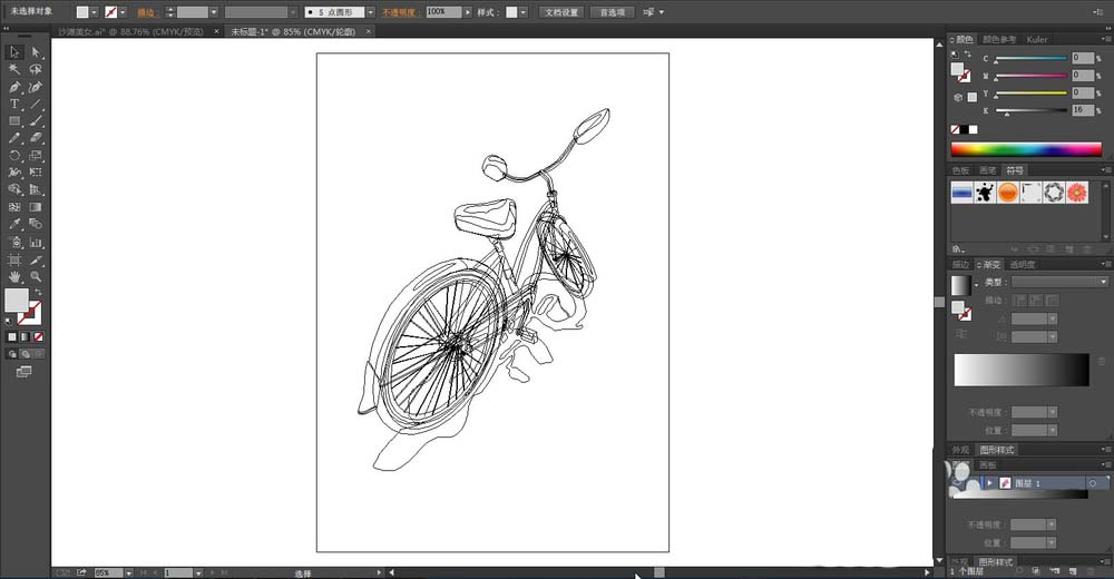 1、先用钢笔画出一辆单车的形状,我们重点画出前后的车轮,车头与车的踏脚的细节路径。先用圆形画出车轮的内外层次,再用钢笔一一描绘出车轮的中间的链条的形状,我们全部用封闭路径一一呈现便于后面填色。