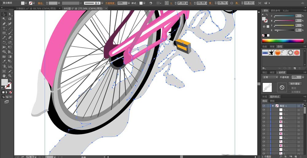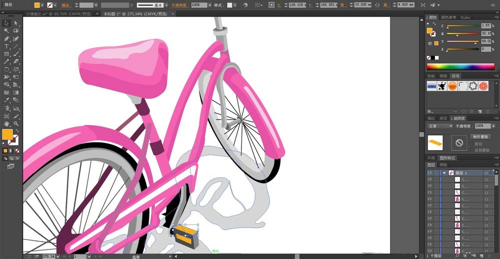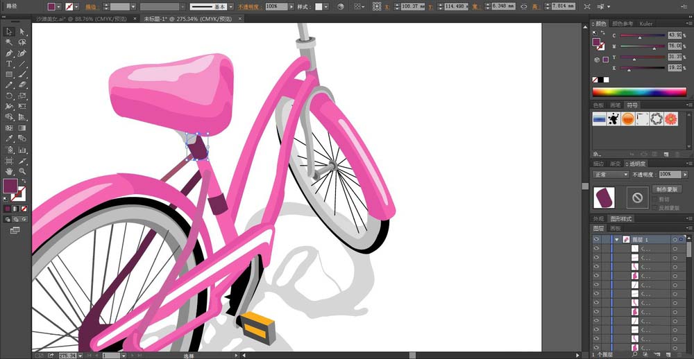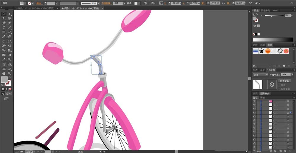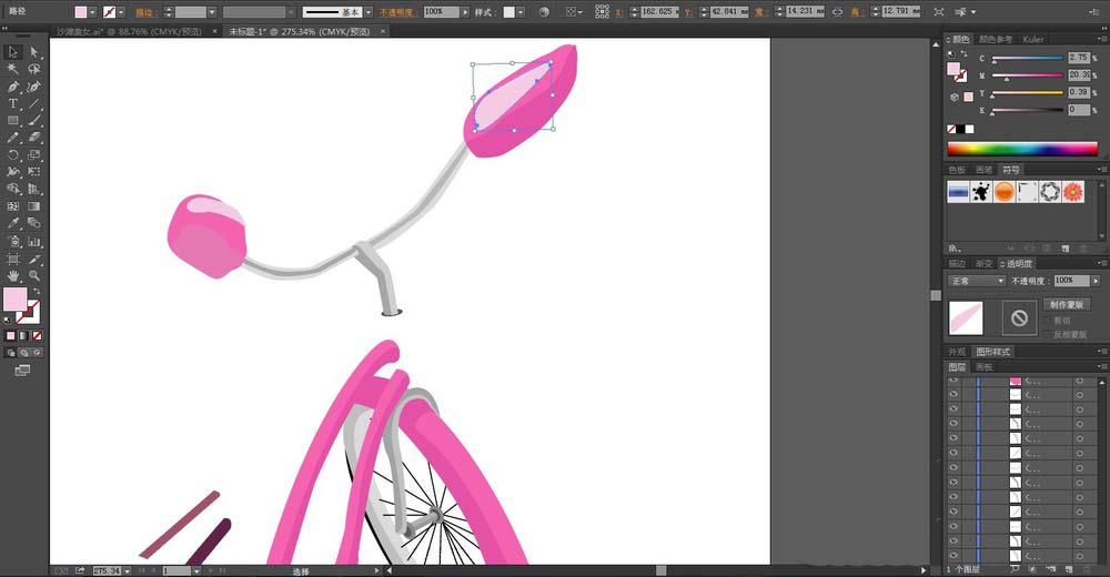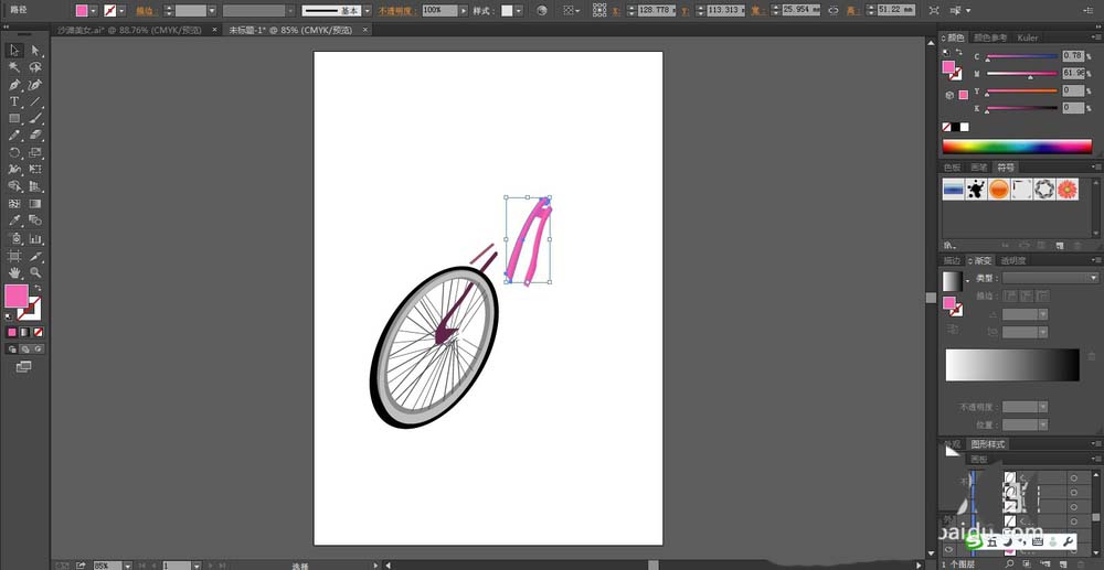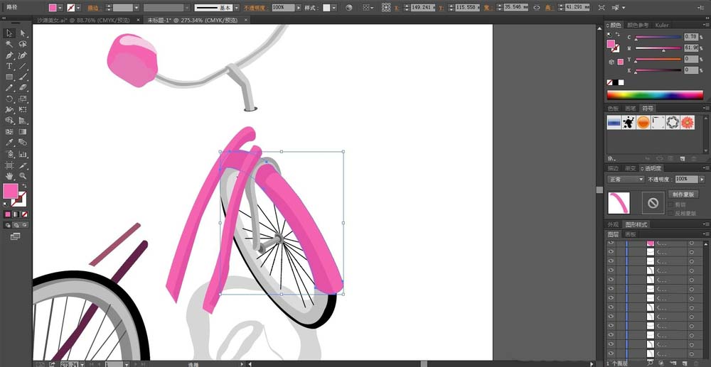 8、单车的后车轮的挡泥板用粉红色与灰白色搭配填充,最后,我们再画出单车的阴影在下方,我们设置透明度为30%的灰白色填充,完成粉色单车设计。