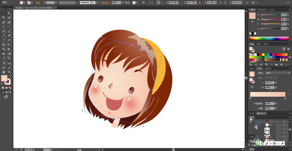 2、我们用咖啡色的渐变填充女生的头发,用粉色的渐变填充女生的脸蛋,用粉红色的渐变填充女生的嘴巴,用橙色的渐变填充发卡的路径。
