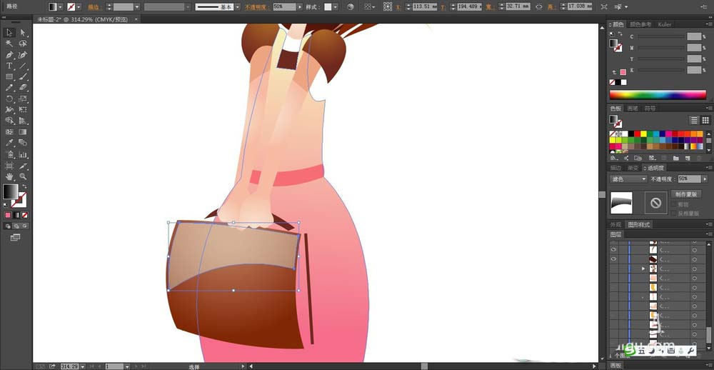 3、用桃红色的渐变填充女生的裙子的路径,再用咖啡色的渐变填充她手里的包包的路径,包包上面的高光区域用滤色状态的半透明的白色填充。