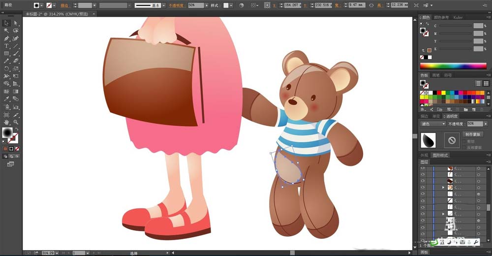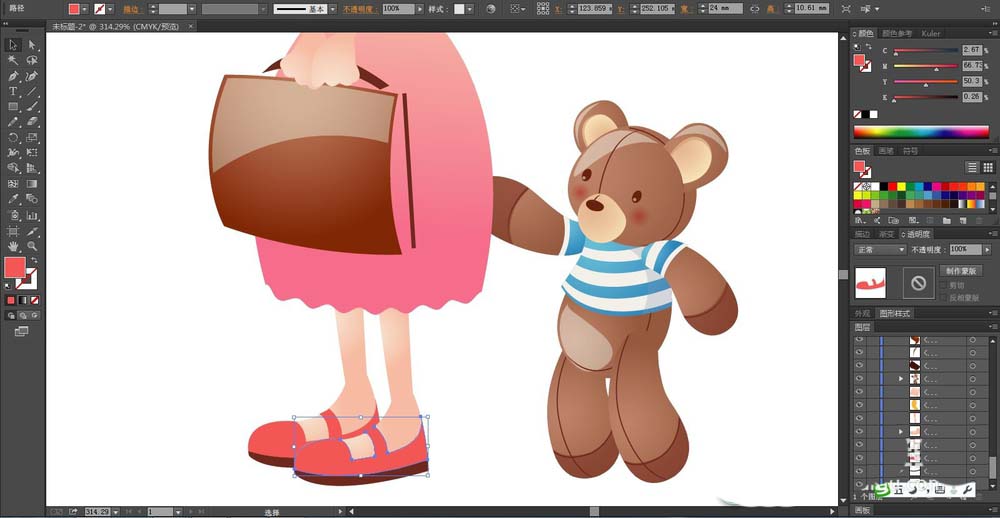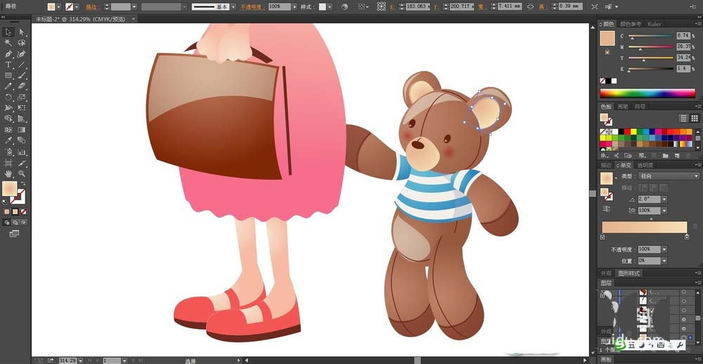 4、女生的皮肤用粉色的渐变填充,鞋子用粉红色与灰黑色搭配填充,女生手里的熊用咖啡色的渐变填充,小熊的衣服用蓝色的渐变与白色搭配填充。