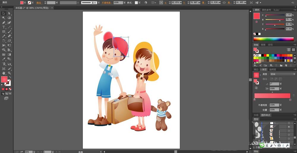 7、用不同明度的黄色填充女生的帽子,用粉红色的渐变填充男生的帽子的路径。