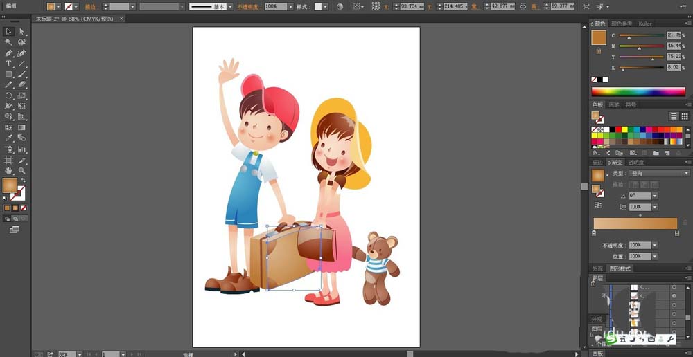 9、男生的鞋子用咖啡色的渐变与灰黑色搭配填充,男生的旅行箱用不同明度的咖啡色的渐变填充,正面稍亮一些,左侧面要暗一些,箱子上方的金属件用灰白色的渐变填充出金属的感觉,完成旅行场景画设计。