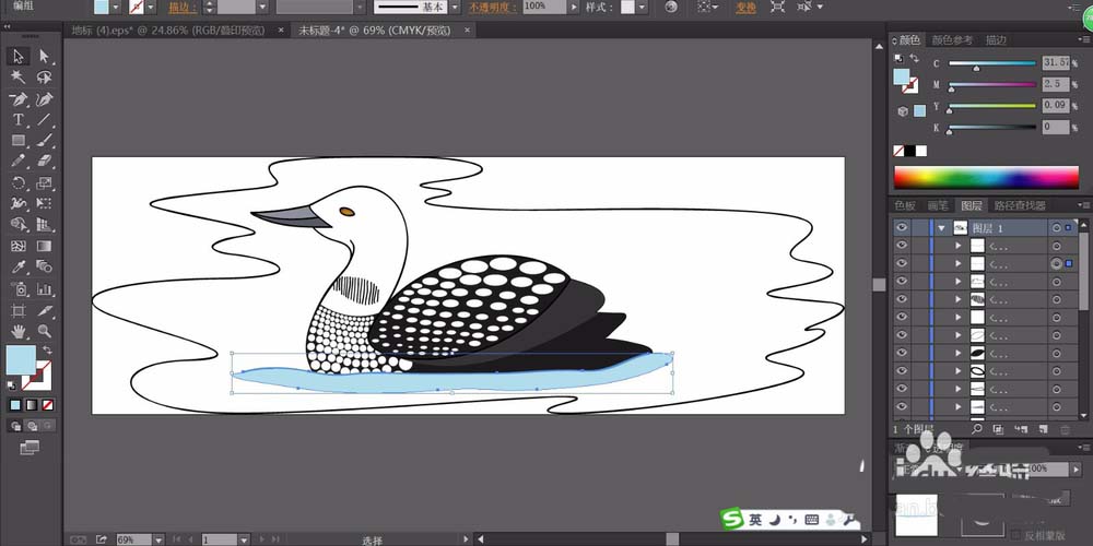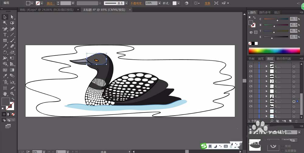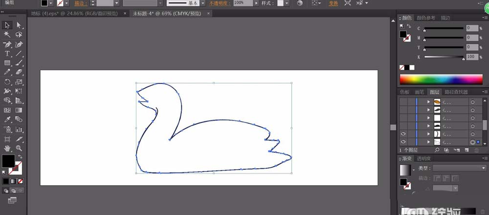 1、先用钢笔把黑雁的身体轮廓绘制出来,再一一绘制出它的翅膀、嘴巴、眼晴等身体的细节元素,接着,再把黑雁所在的河流的轮廓也一一用封闭路径呈现出来。