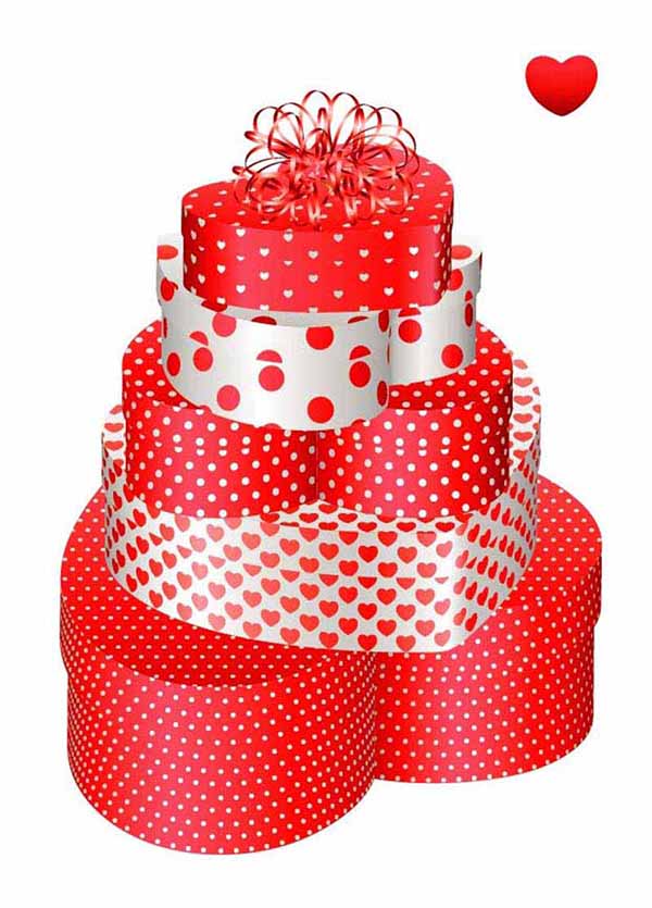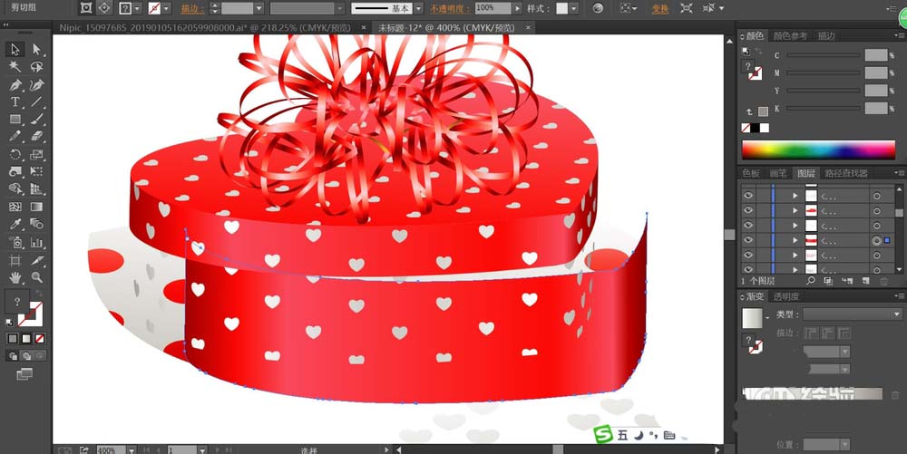 4、接着,我们再用心形工具绘制红色礼盒下方的白色礼盒的顶端心形路径,我们用灰白色的渐变填充路径,再用红色的渐变填充圆点的路径。