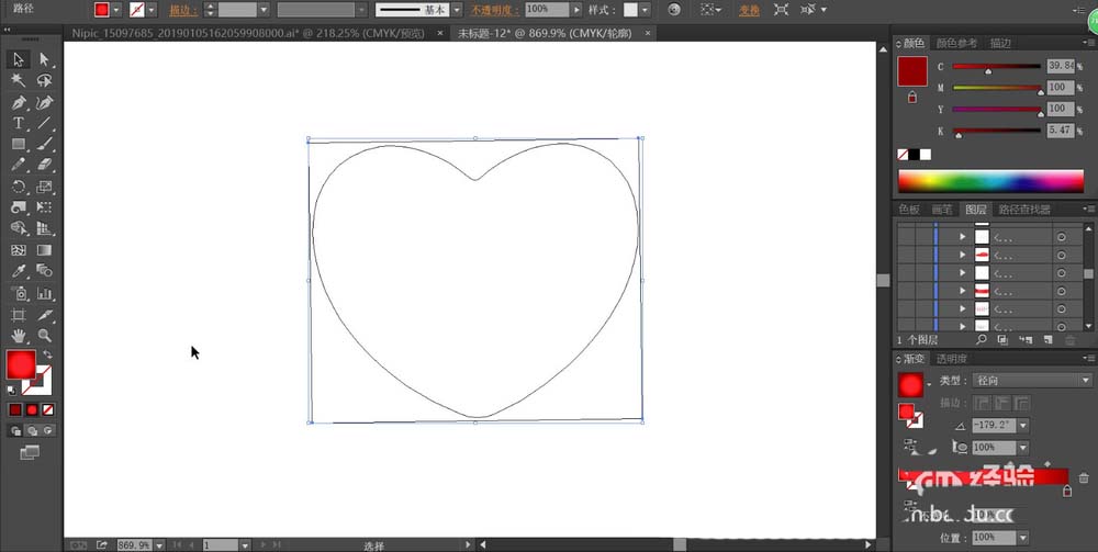 1、先用心形矢量工具画出一个心形的路径,我们再这个心形路径与设置好红色渐变的矩形做一下剪切蒙版的操作,让红色的心形出现在图片的右上侧。接着,我们绘制出一个封闭的卷边路径,用同样的方法做出红色渐变的卷边,复制成花卷的形状。