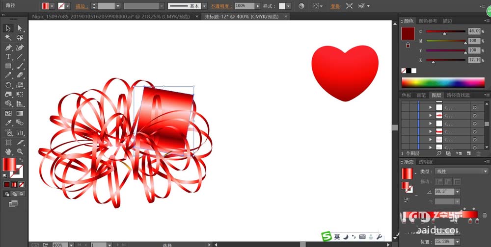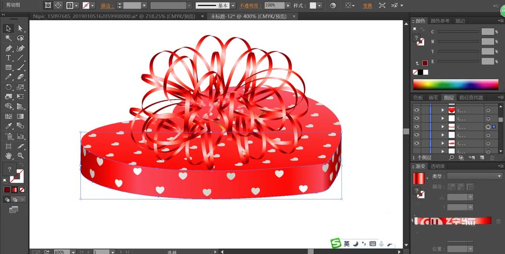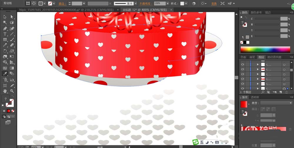 6、继续往下绘制礼盒的形状与填色,让颜色的搭配再次反转,用红色的渐变填充礼盒,用灰白色的渐变填充图案,直到整个心形礼盒的绘制全部完成。