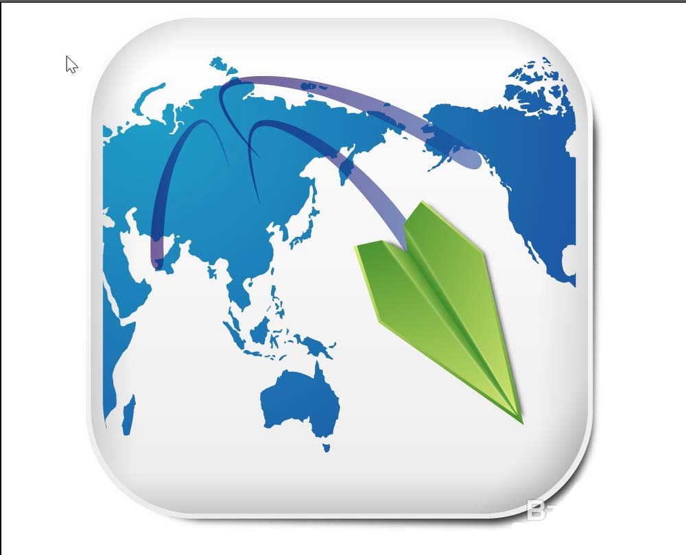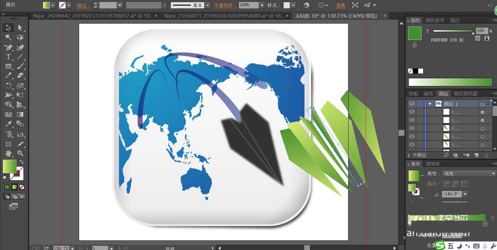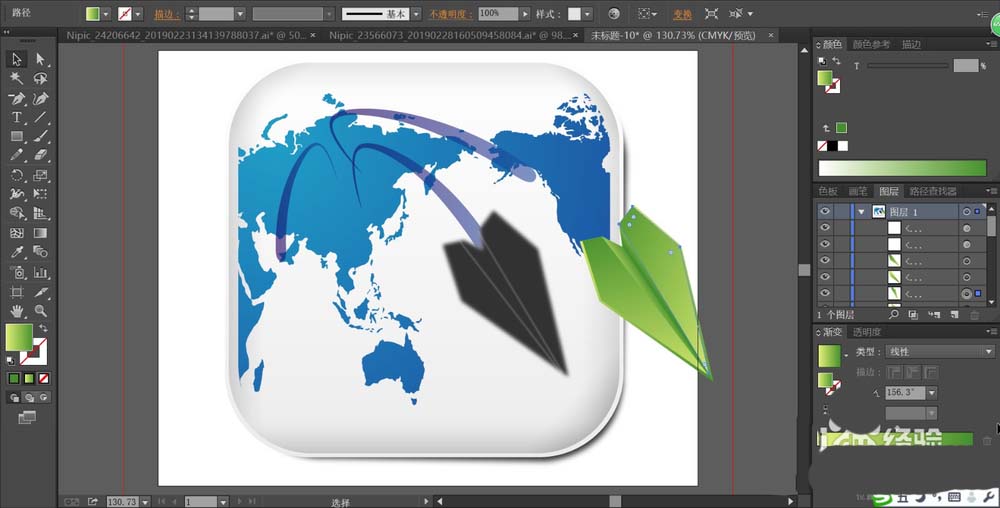 6、最后,我们画出纸飞机的细节路径,分别填充不同角度的绿色的渐变,再组成一个整体,画出飞机的阴影路径填充灰黑色并做高斯模糊,完成地图图标设计。