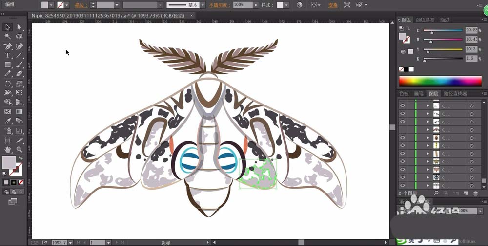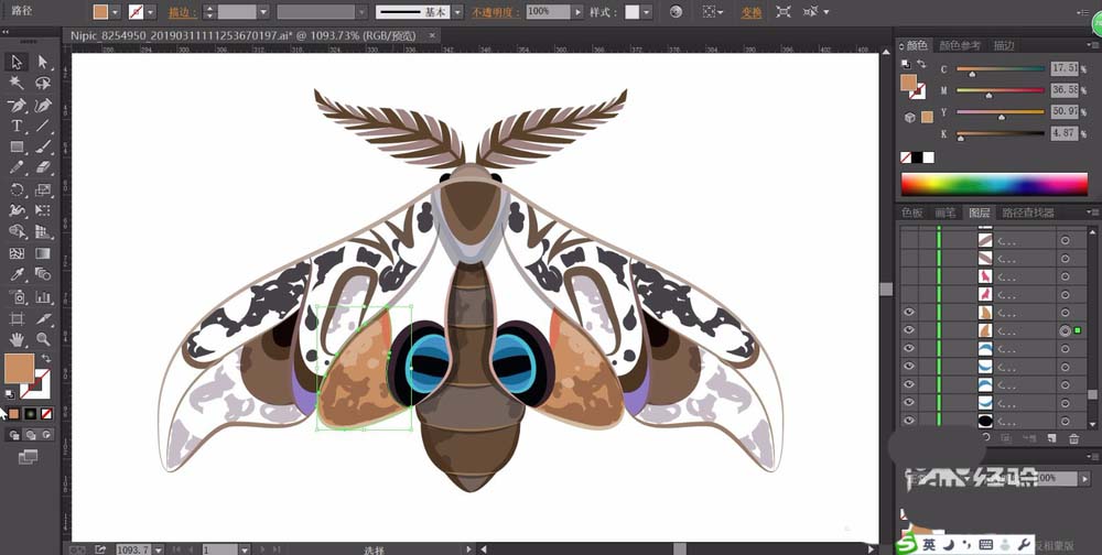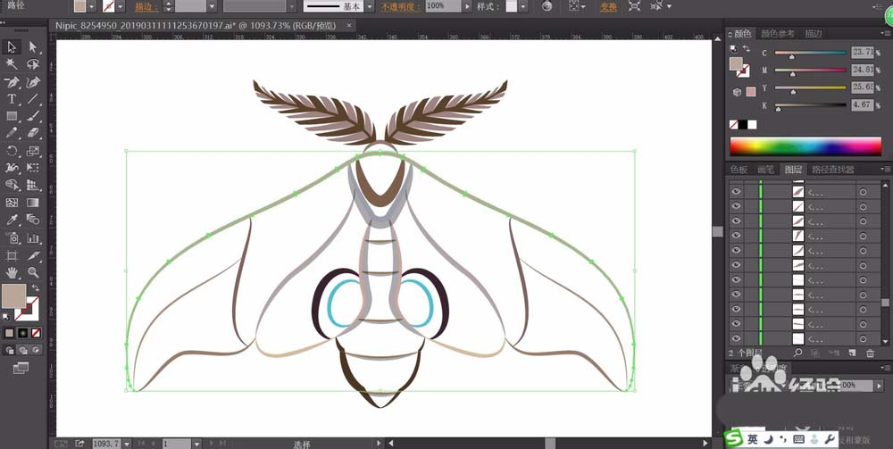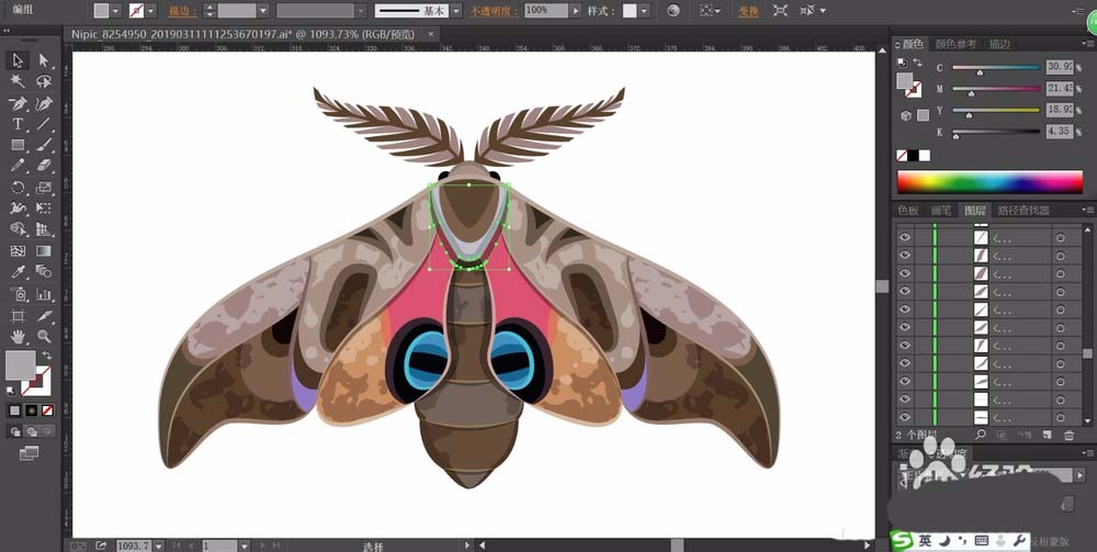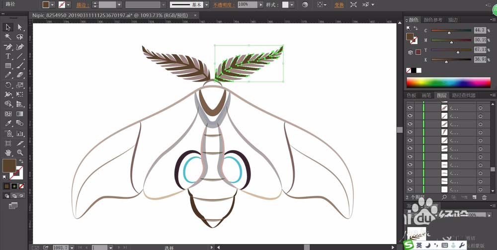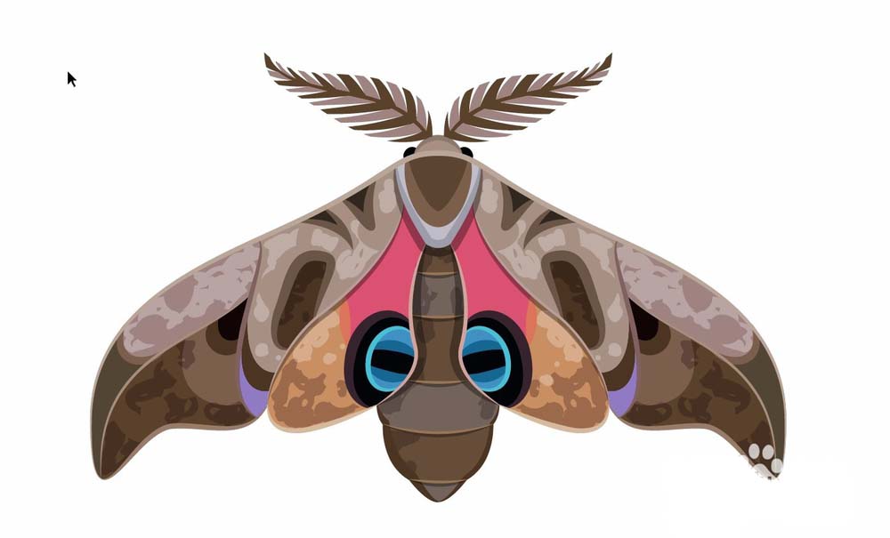 2、用棕灰色与橙灰色搭配填充飞蛾的头部的树叶形状的触角路径,用橙灰色与棕灰色给飞蛾的翅膀进行描边。