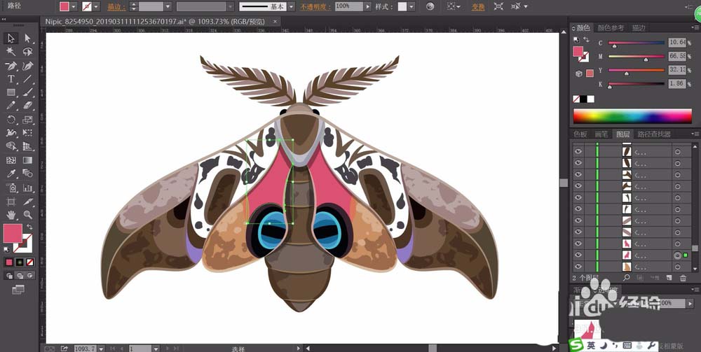 3、重点用不同明度的蓝色对于飞蛾的翅膀上面的眼晴图案进行描边与填充。