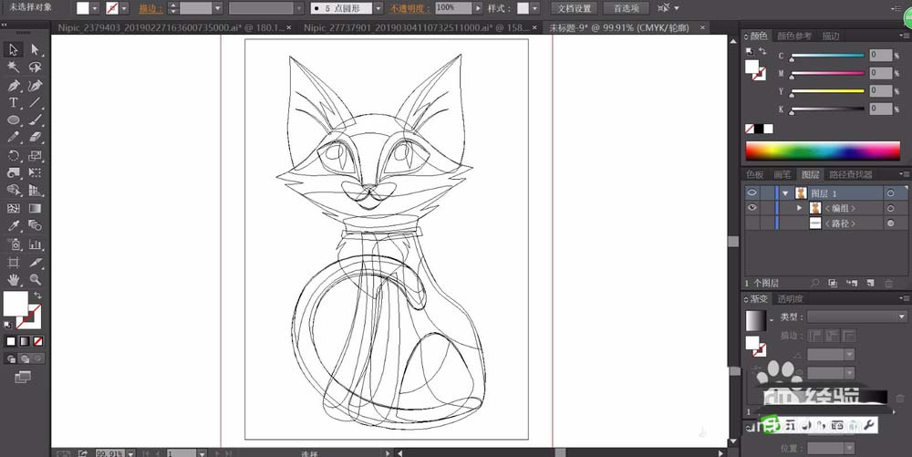 1、先用钢笔把猫的整体结构一一绘制出来,从大的耳朵到头部的眼晴、鼻子、嘴巴,再到猫的身体动作与尾巴、脚等细节元素一一绘制成封闭路径。