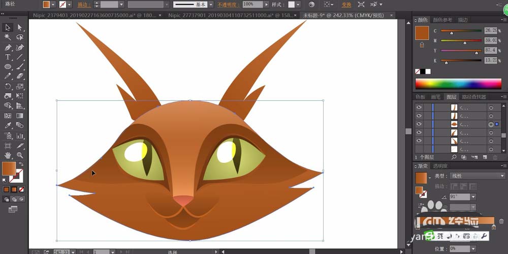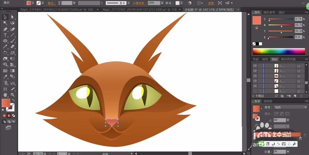 3、用亮棕色与暗棕色搭配填充猫的头部,用粉红色的渐变填充猫的鼻子的路径,用暗棕色的渐变填充猫的嘴巴路径。