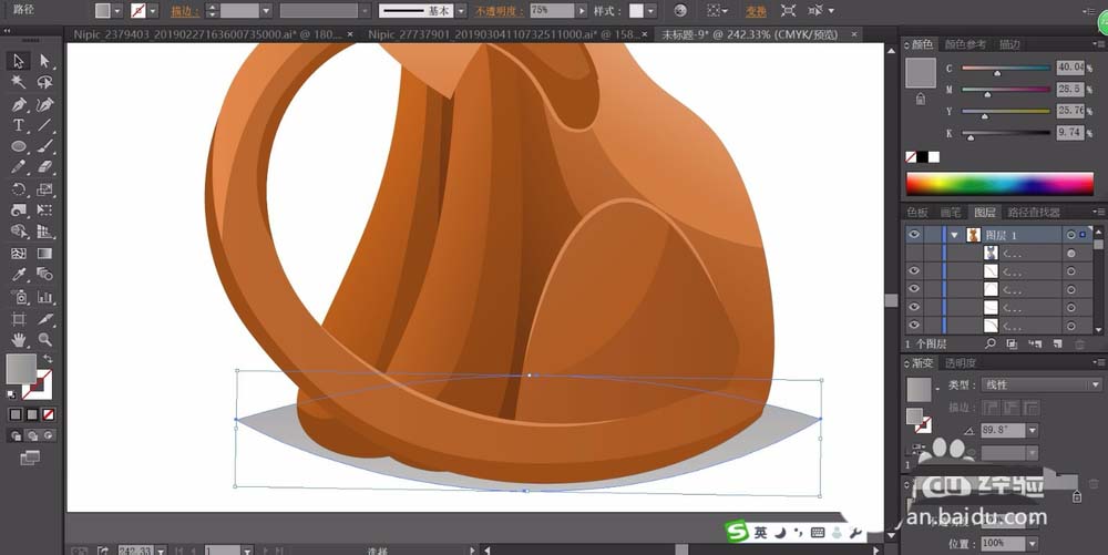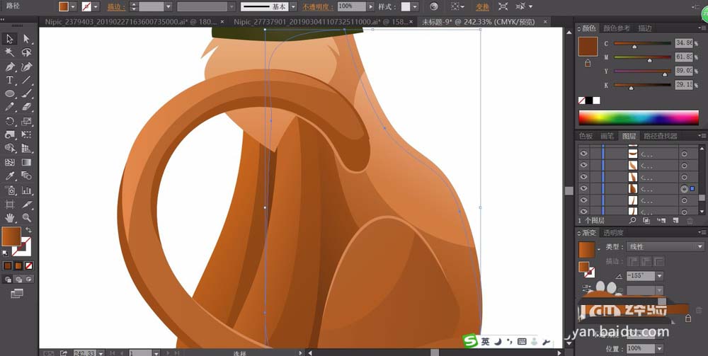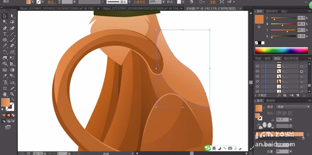 5、使用不同明度的棕色渐变填充猫的身体结构元素,让高光出现在猫的身体的右侧,让暗光呈现在猫的四肢右侧,不同的侧面用不同的棕色渐变填充。