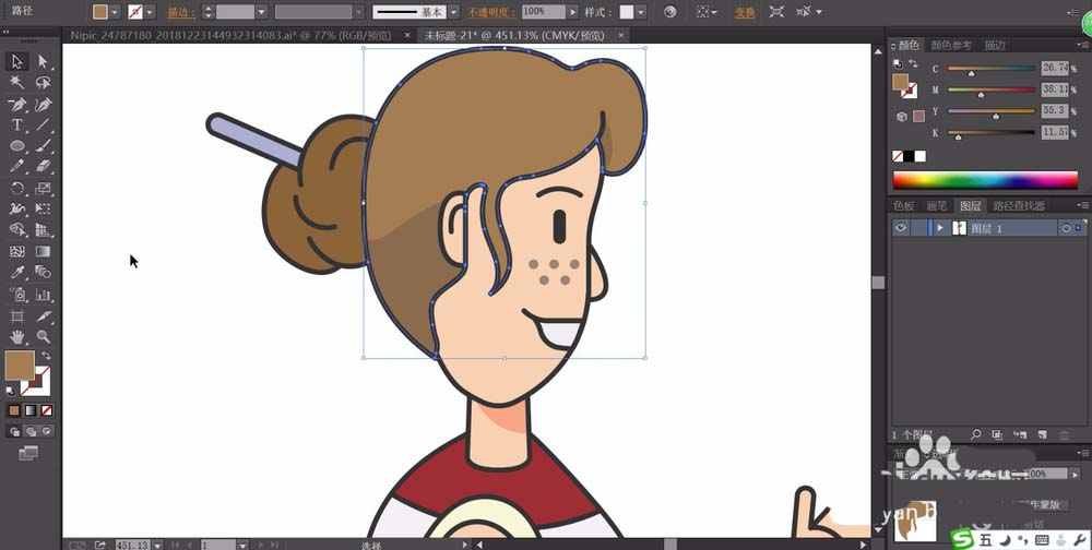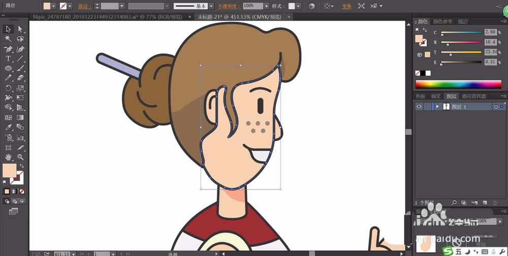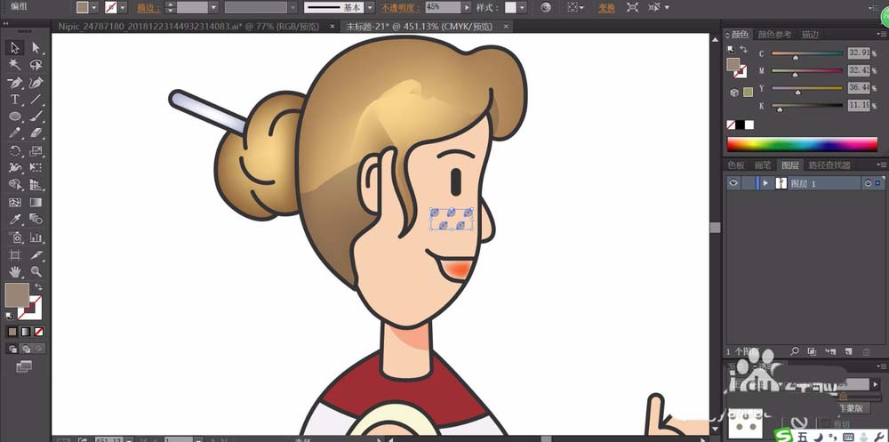 3、用网格工具给头发做出渐变效果,用粉红色的渐变做出嘴唇效果,脸上的雀斑用正片叠底的灰色填充。