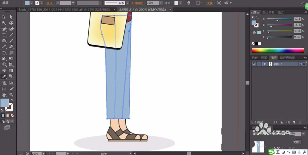 6、用天蓝色填充女人的长裤路径,用棕灰色填充女人的鞋子,用粉色填充腿部皮肤,再用网格工具分别给长裤与鞋子做出蓝白色与棕灰色到白色的渐变,完成背包女人形象设计。