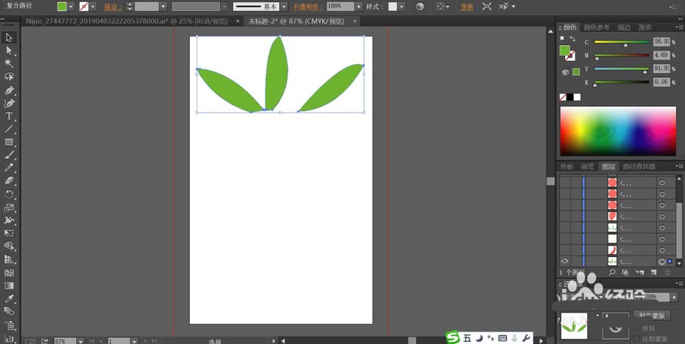 2、设置前景色绿色,我们用绿色填充草莓上面的叶子的路径。
