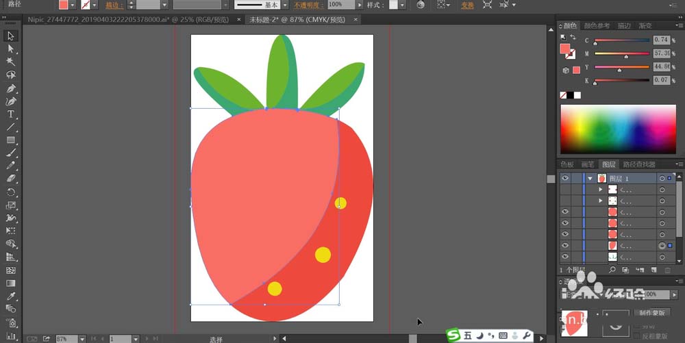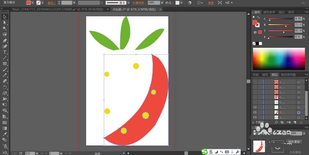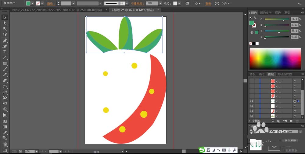 4、继续用黄色填充草莓左侧的颗粒的路径,再用深绿色填充叶片上面的暗光区域。