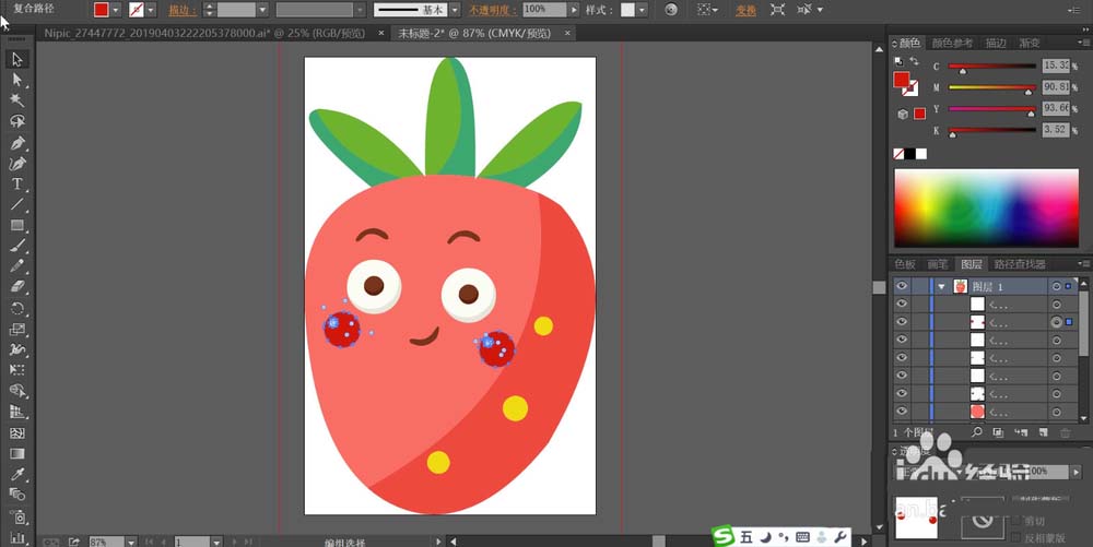 7、最后,我们用暗红色填充草莓脸部的两个红晕,再用网格渐变做出红色的渐变效果,完成草莓表情包设计。