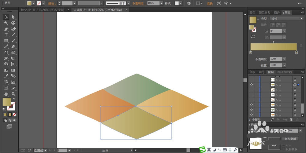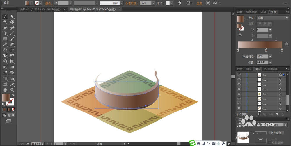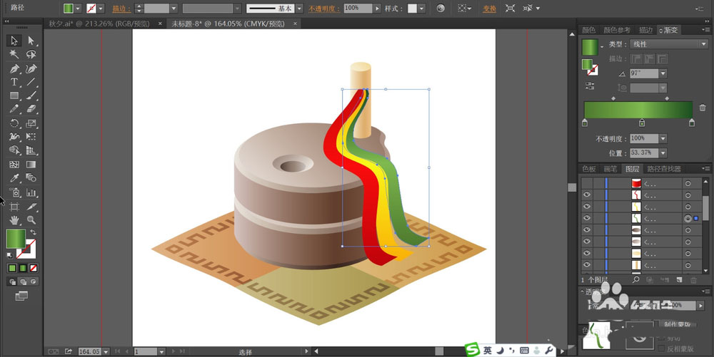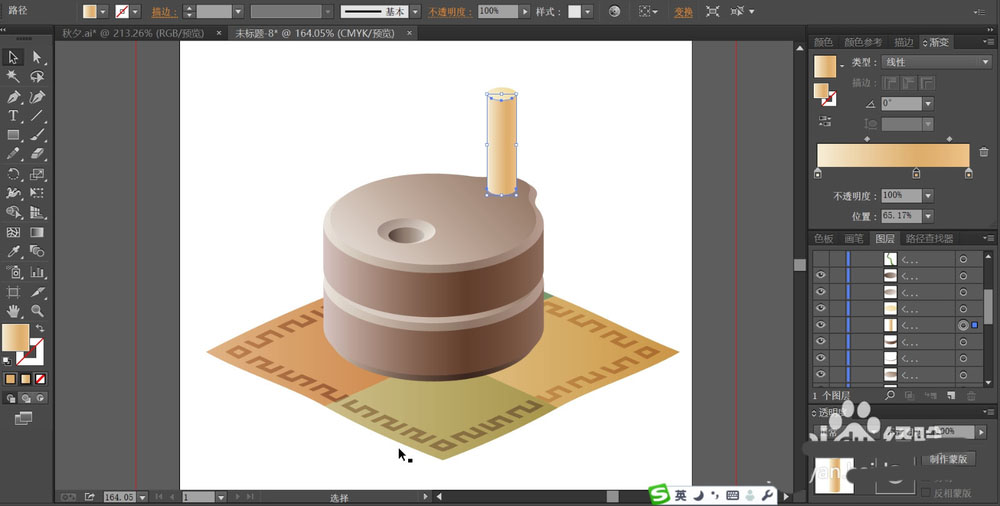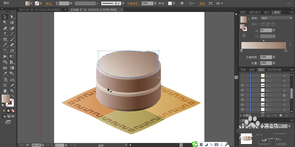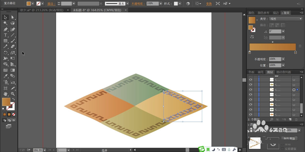 2、用青色、土黄色、土红色、茶色的渐变分别填充毯子上面的不同区域的路径。