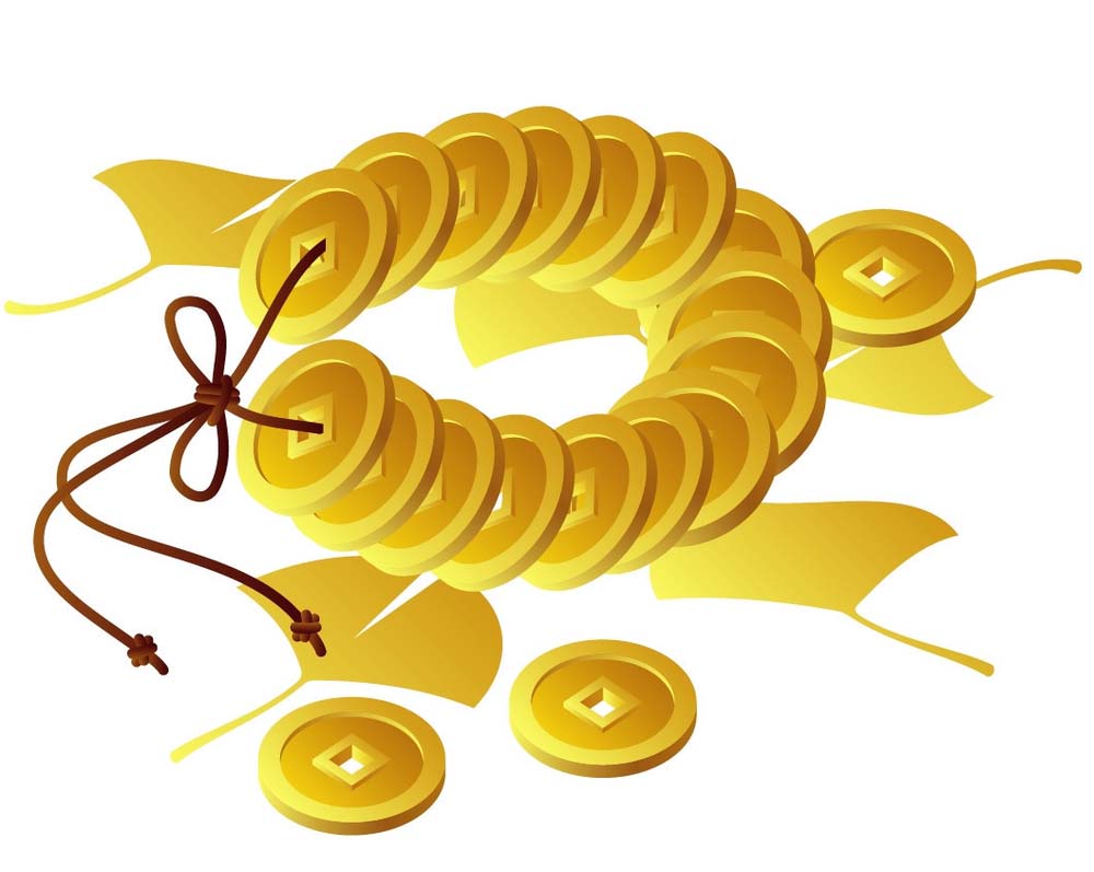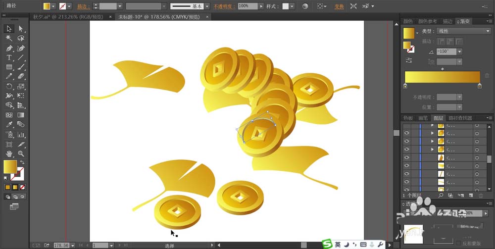 5、用金色填充所有的钱币,再用咖啡色的渐变填充钱币左侧的绳索的路径。