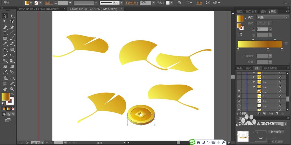 2、我们调出金色的渐变填充地面上的树叶,让所有的树叶在金色调中进行变化,从而呈现出整体统一又有变化的色彩感觉。