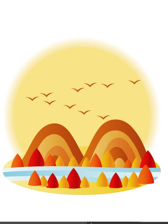 7、使用淡黄色到白色的渐变填充天空中的大太阳,使用黄色的渐变填充河流对面的地面,完成山水风景画设计。