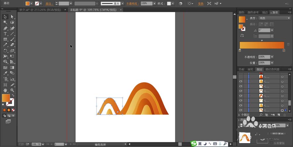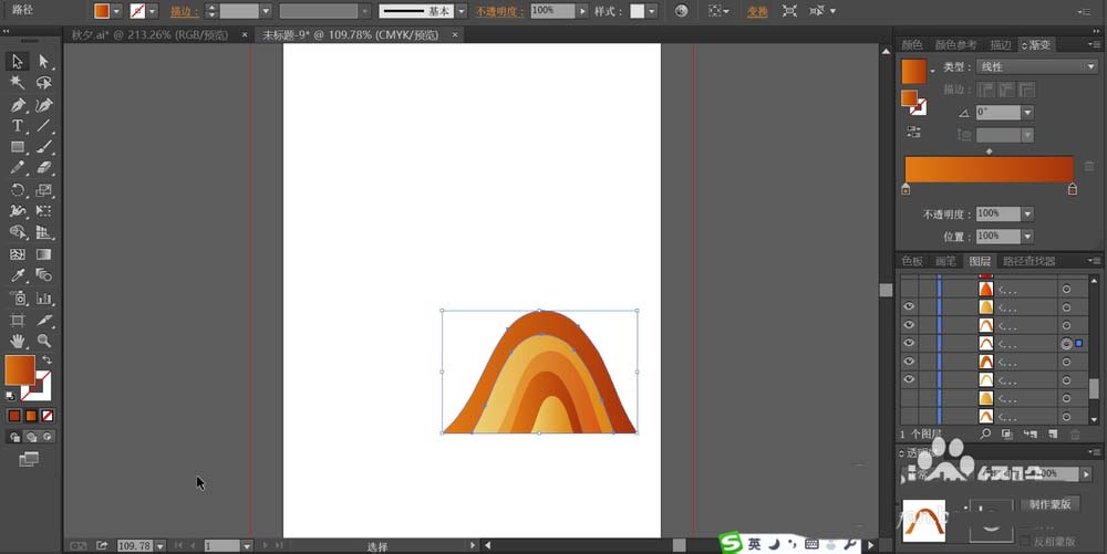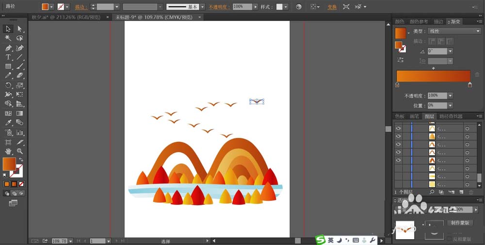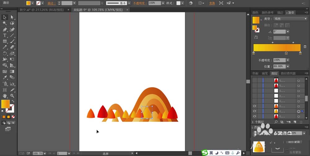 3、继续使用不同明度的褐色与黄色填充小的山,再用红色的渐变、褐色的渐变、黄色的渐变分别填充不同的山。