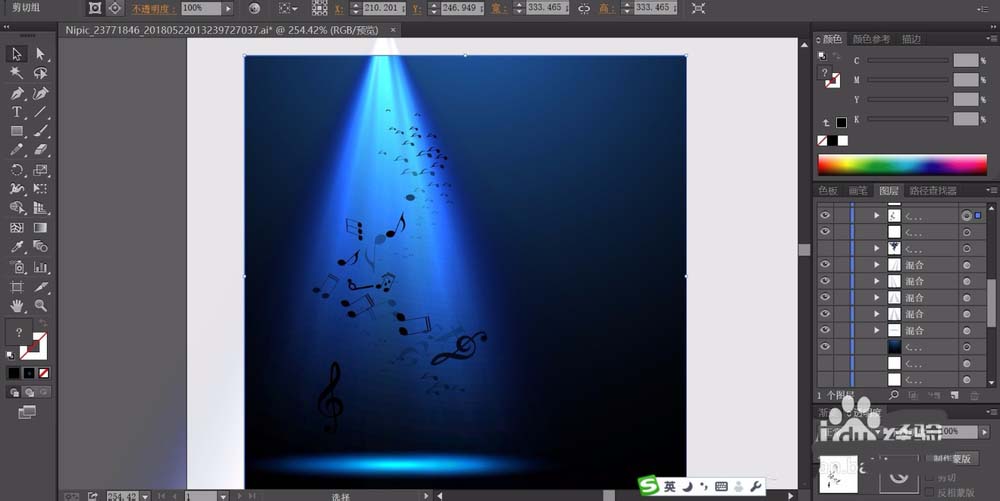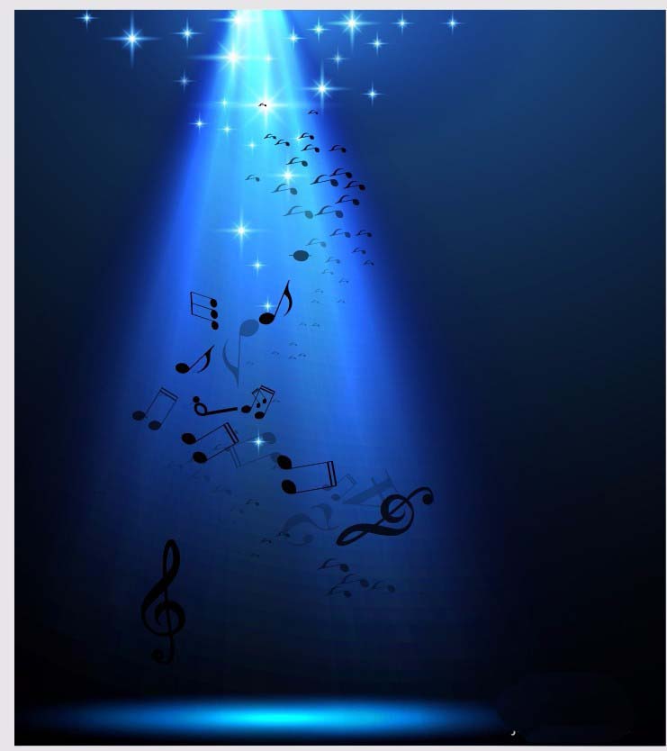 4、在光影当中加入一些音符的元素,这些音符填充蓝黑色,模式为正片叠底,我们在射灯光线的上方与下方都加入很多的音符元素。