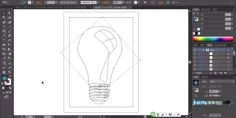 6、这一步,我们用灰白色的渐变填充灯泡表面的高光路径,可以设置成滤色模式,或者简单的改变一下元素的透明度就可以实现。
