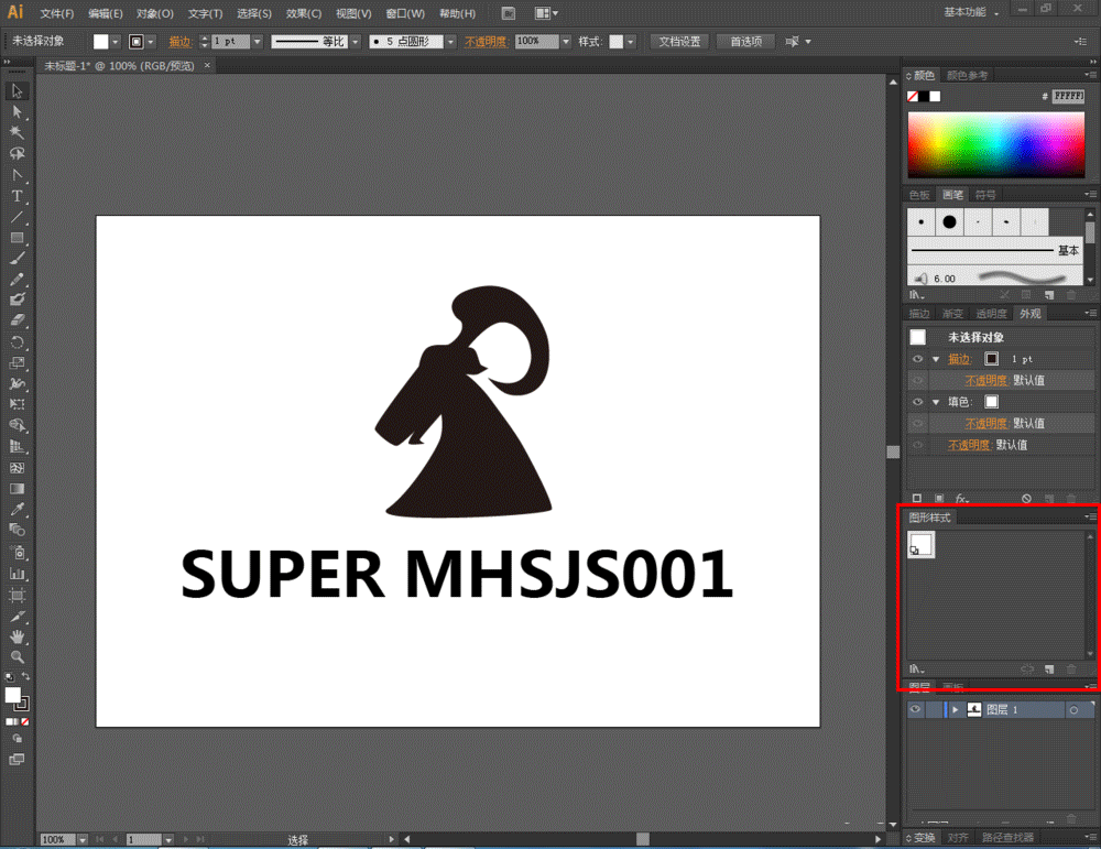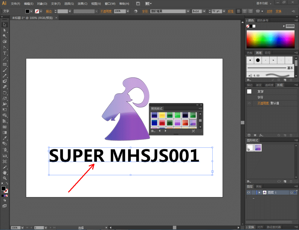3、点击【文字工具】,按图示设置好文字的字体、大小、颜色等参数后,输入文字内容:SUPER MHSJS001,完成文字部分的制作。完成后,调整好文字也图案的位置关系(如图所示);