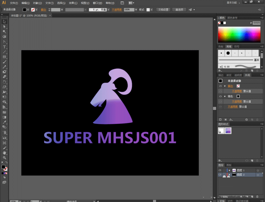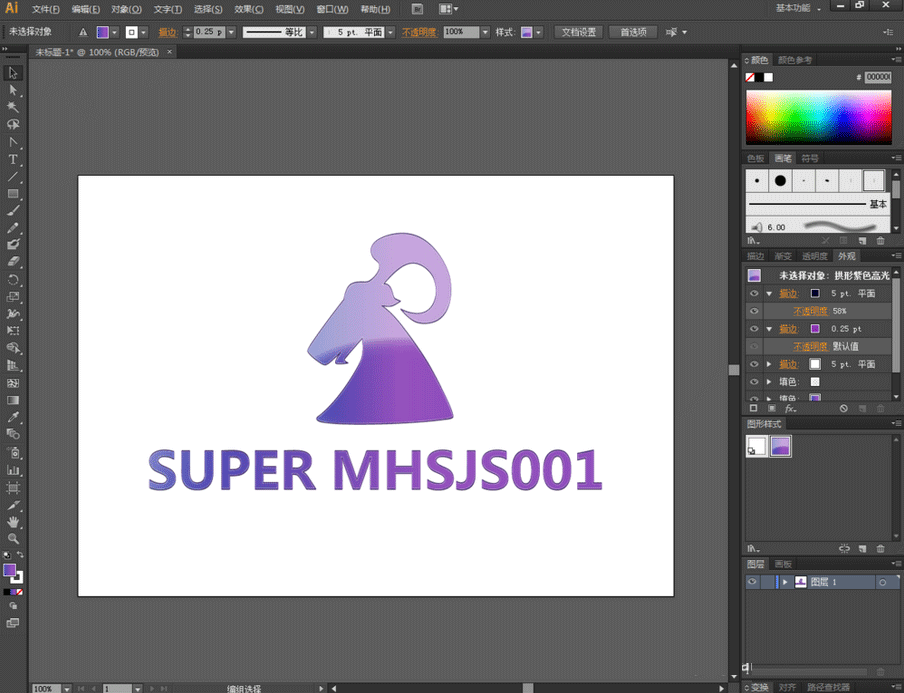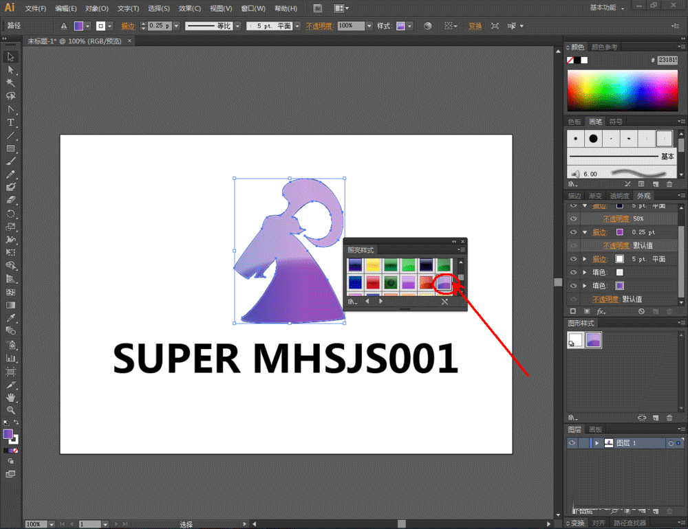5、选中自定义图案,点击照亮样式工具栏中的【拱形紫色高光】,为图案添加上拱形紫色高光效果。选中“SUPER MHSJS001”文字部分,同样点击照亮样式工具栏中的【拱形紫色高光】,为文字也添加上拱形紫色高光效果。这样我们就完成了图案和文字的拱形紫色高光效果制作。