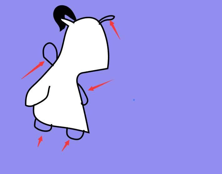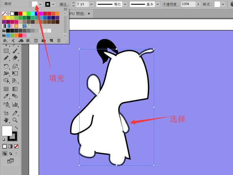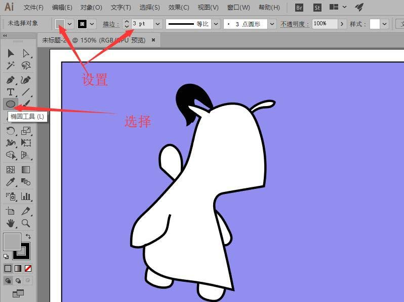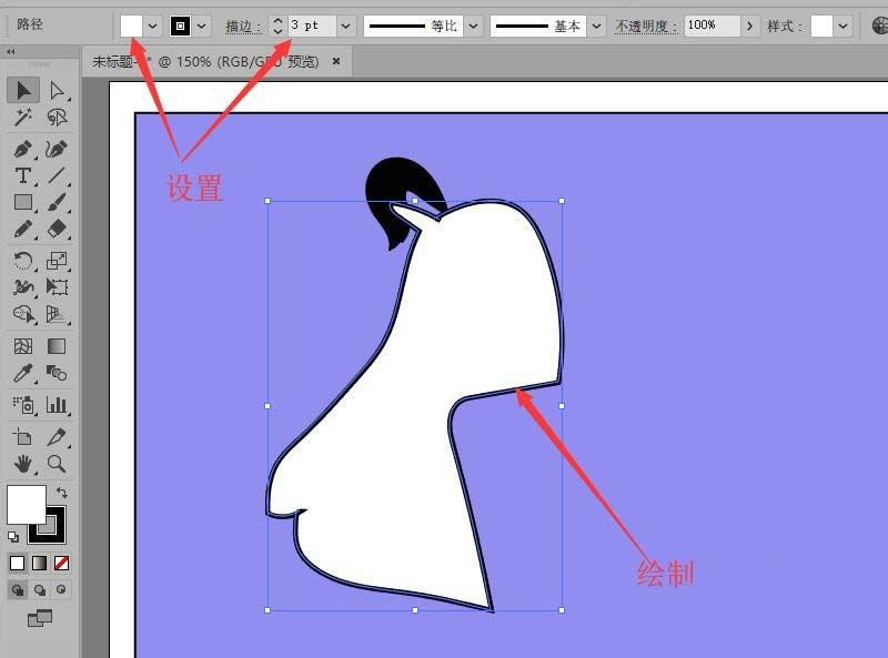 4、按住‘Ctrl’键单击空白区域,取销对路径的选择,再次单击【铅笔工具】。拖动鼠标绘制出身体,设置描边为3pt ,填充为白色。