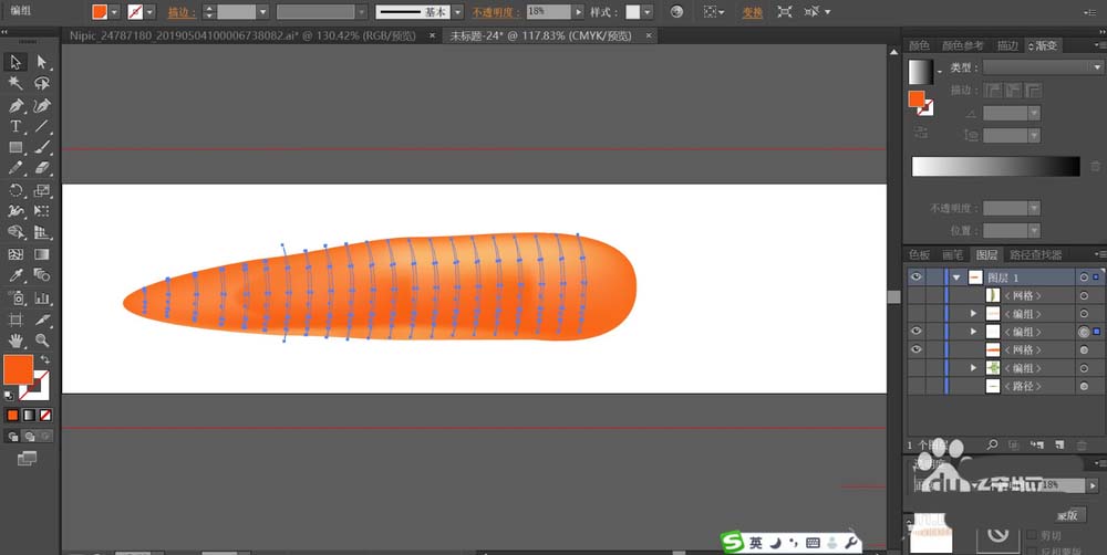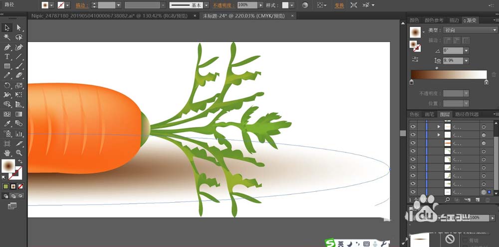 7、最后,我们用灰白色的渐变填充这个阴影的路径,设置成正片叠底模式,完成阴影的绘制,胡萝卜图片设计完成。