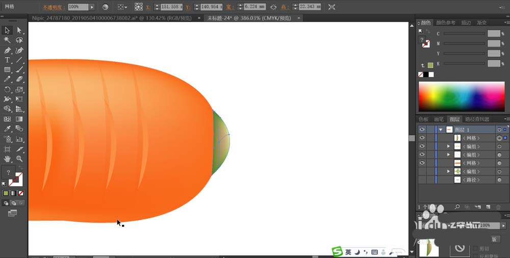 6、这一步,我们用绿色填充胡萝卜右侧的绿叶,再通过网格工具做出黄绿色的渐变效果。
