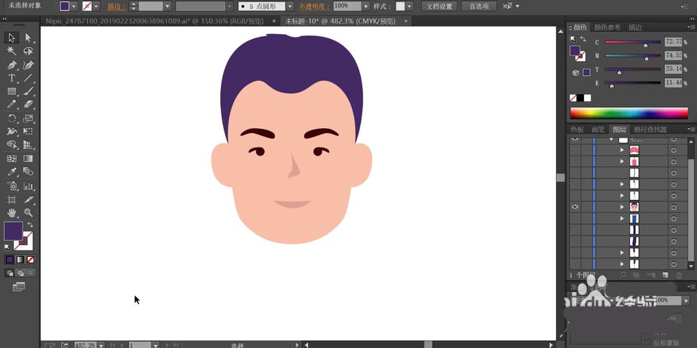 1、先用钢笔画出男生的基本表情,再用粉色填充脸蛋,用蓝色填充头发,用灰黑色与白色填充眼,用暗红色填充嘴唇,我们再使用网格工具给头发与眉毛做出渐变的效果。