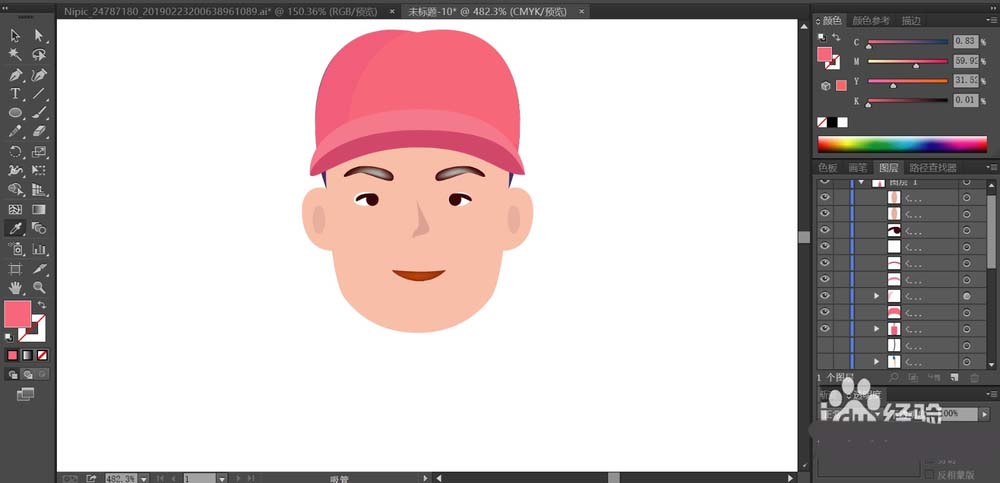 3、我们还可以使用钢笔给男生加上一顶帽子,使用三种不同明度的粉红色填充帽子的高光与暗光,让帽子更加的特别。